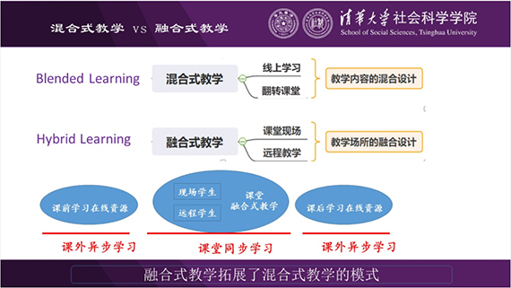 清华大学心理学系钱静副教授开展“并行兼顾、融合交互——2021年秋季融合式教学设计”专题分享,用“为什么”、“什么是”、“如何组织”这样一条逻辑主线介绍了融合式教学的探索内容和总结的经验。通过融合式教学案例指出融合式教学是混合式教学的拓展,教室内同学和线上同学采用线上线下并行的交互模式有较好的教学效果。