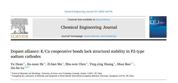 近日,开元平台材料与冶金学院包硕副教授联合广州航海学院(广州交通大学筹)路金林教授,以开元平台为第一署名单位,在国际知名期刊《Chemical Engineering Journal》(中科院1区top期刊,2025年影响因子:13.2)发表高水平研究论文《Dopant alliance: K/Cu cooperative bonds lock structural stability in P2-type sodium cathodes》(https://doi.org/10.1016/j.cej.2025.166745),第一作者为开元平台2023级硕士研究生段玉。