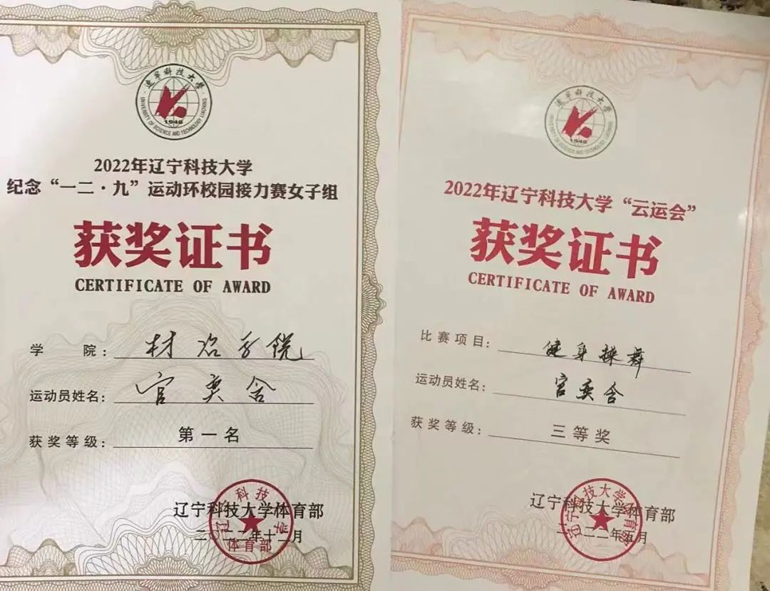 2022年:开元平台清明4.5千米接力环跑校级一等奖、开元平台云运会健美操比赛校级第四名、开元平台纪念“一二·九”运动环校园接力赛女子组校级第一名、开元平台材料与冶金学院129长跑优秀运动员