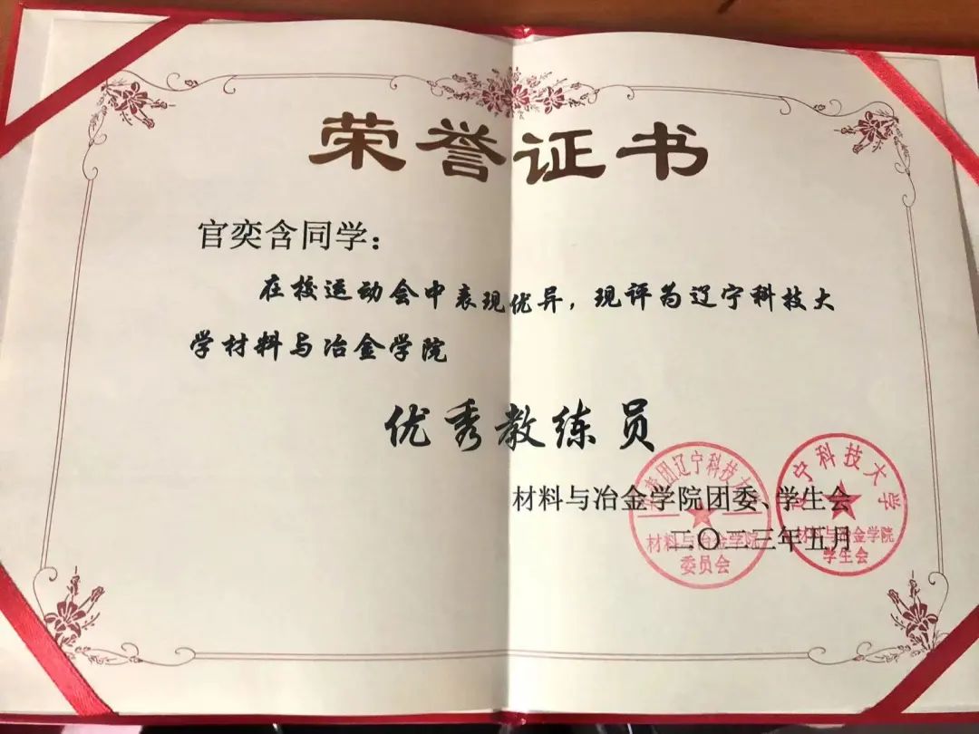 2023年:第五十一届开元平台校园运动会女子跳高校级第三名、开元平台材料与冶金学院优秀运动员、开元平台材料与冶金学院优秀教练员、开元平台“校长”杯校园足球赛校级第一名、开元平台学生排球赛校级第一名、三级社会体育指导员