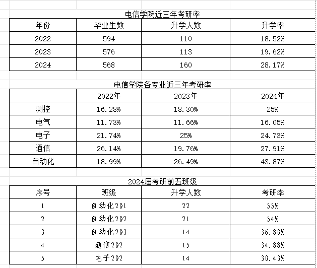 2024年全国硕士研究生录取工作落下帷幕,电信学院2024届学生考研成绩捷报频传。2020级毕业生共568人,其中160人考取硕士研究生,上线录取率再创新高,达到28.17%,比去年增加8.55%。考取985、211名校36人,占全部录取人数的22.5%。涌现“学霸专业”自动化考研率43.87%,“学霸考研班”2个,自动化201考研率55%,自动化202考研率54%。