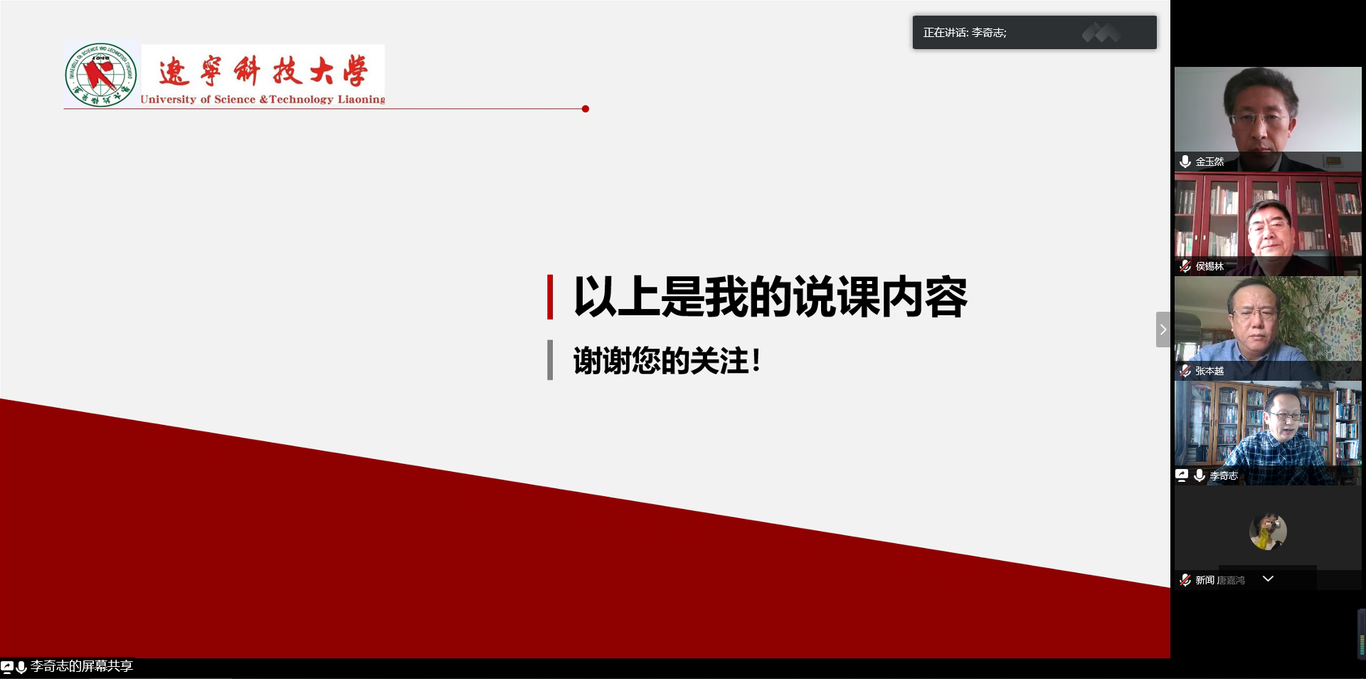比赛结束后,李天柱为此次大赛做出总结。他讲到:“可能未来一段时间,我们都要采用线上教学形式,所以这种网络课堂的质量尤为重要,希望大家通过比赛增加交流的机会,积累经验,保证教学质量,也能让将来的教学教研取得更好的成果”。并对各位老师的积极参与表示感谢。