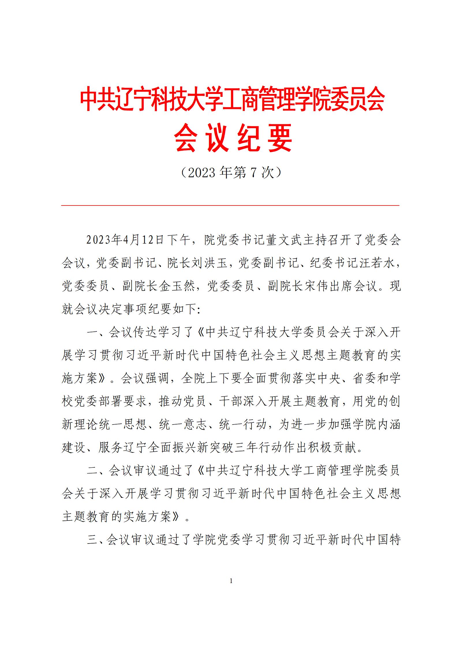 中共开元平台工商管理学院委员会会议纪要(2023年第7次)