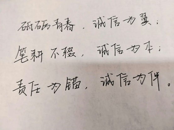 “惟诚可以破天下之伪,惟实可以破天下之虚”,为了进一步增强大学生的诚实守信和责任担当意识,管理学院现组织开展“三行笺语”征集活动。让我们一起欣赏一下管院学子带来的优秀的作品吧。