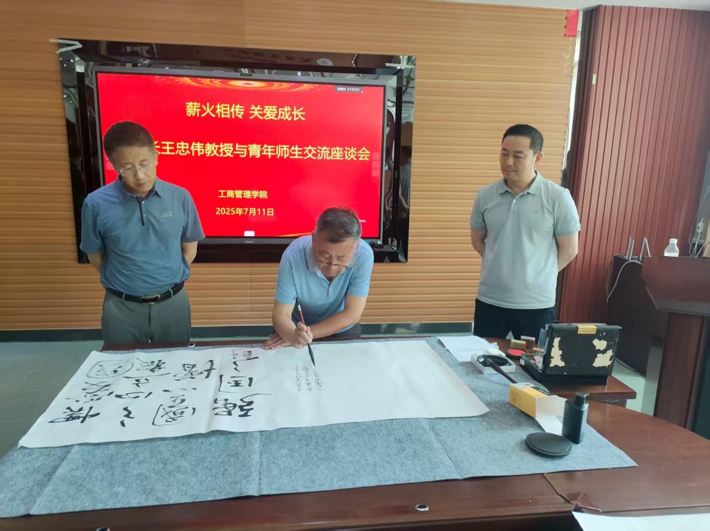 随后,老院长王忠伟教授深情回顾学院的开创历程。专业整合时的艰辛,硕士点申报成功时的喜悦在王教授的讲述中一一浮现。这些奋斗故事,不仅是学院发展的珍贵记忆,更是激励青年师生不断前行的精神动力。针对青年教师的成长,王忠伟教授提出了宝贵建议,他指出青年教师要高度重视科研工作,只有不断深耕科研,才能为学生带来更优质的教育。座谈会最后,王忠伟教授“翰墨寄深情”,现场为管理学院题词,笔墨间满是对学院未来发展的殷切期望。