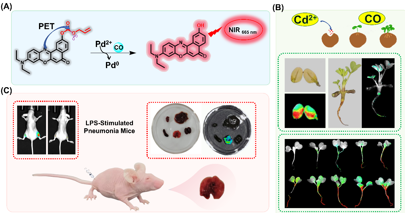 一氧化碳(CO)作为一种重要的气体信号分子,在生物体内扮演着复杂而关键的双重角色。开发特异性强、灵敏高的检测方法用于可视化监测动植物样本中CO水平变化,对于生物医学研究、植物科学和环境监测等领域至关重要。然而,现有技术缺乏能够跨物种、实时、原位和高灵敏检测CO水平动态变化的有效工具,尤其难以穿透致密的植物组织,阻碍了其在疾病治疗与植物对非生物胁迫响应中“双面使命”的深入理解和应用。