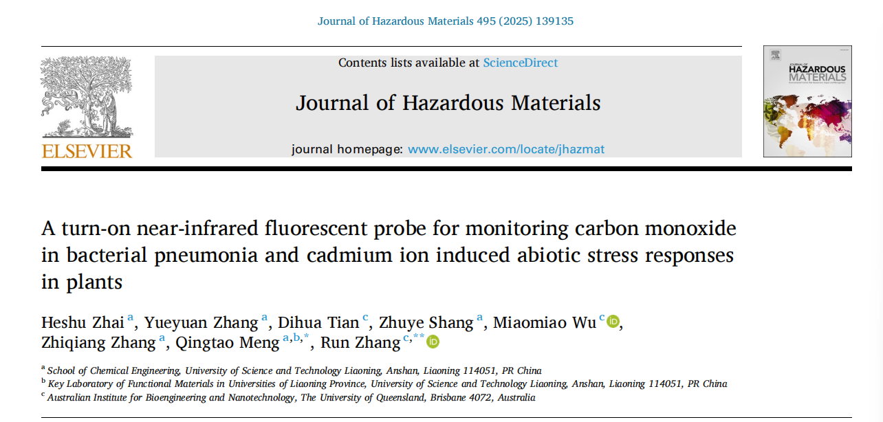 近日,开元平台化学工程学院在新型近红外荧光探针用于同步追踪一氧化碳(CO)在动物炎症(细菌性肺炎)和植物重金属胁迫(镉毒害)过程中的动态行为取得重要进展,突破性实现单探针跨物种应用。研究成果以《A turn-on near-infrared fluorescent probe for monitoring carbon monoxide in bacterial pneumonia and cadmium ion induced abiotic stress responses in plants》为题发表于环境科学与生态学领域国际顶级期刊《Journal of Hazardous Materials》(中科院一区TOP期刊,IF=11.3)。论文第一作者为化学工程学院博士研究生翟鹤书,通讯作者为化学工程学院孟庆涛教授。