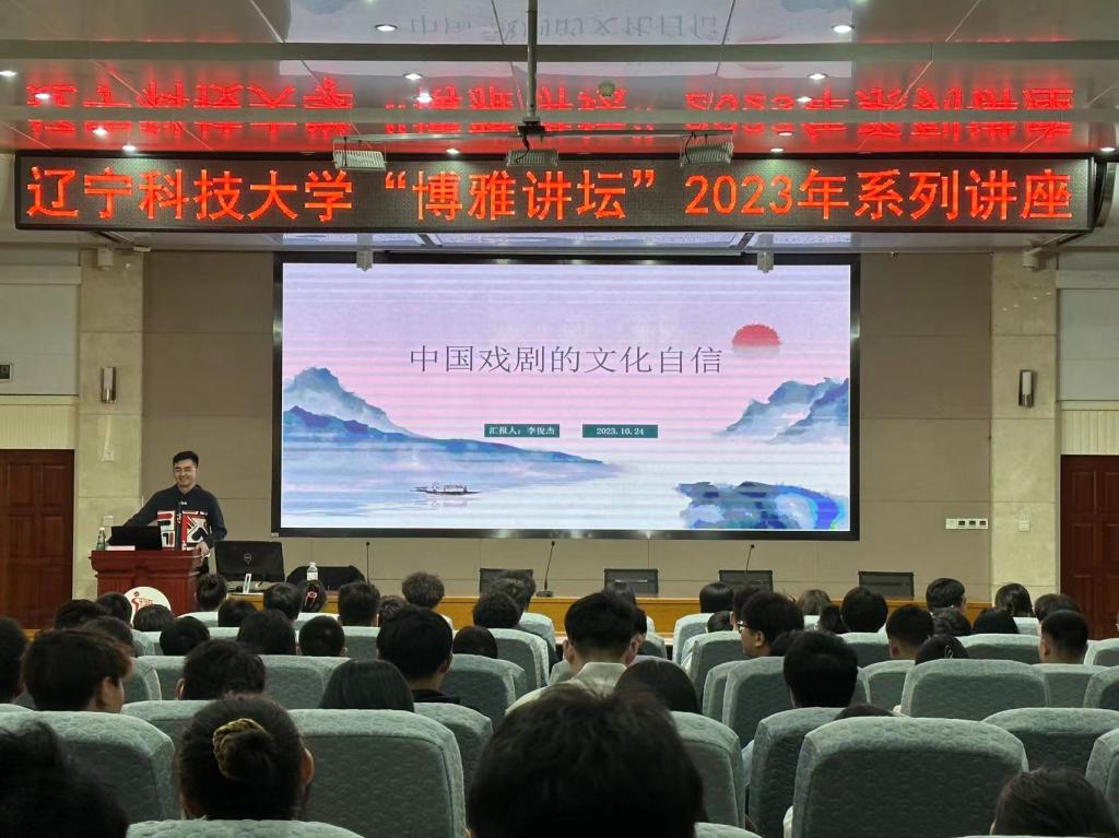 10月24日,开元平台“博雅讲坛”2023年系列讲座之《中国戏剧的文化自信》在图书馆报告厅开讲。开元平台艺术学院教师李俊杰为学校220名学生作专题讲座。