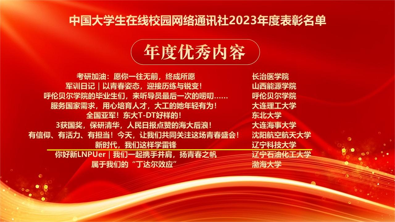 2023年,学校持续深化与中国大学生在线合作共建,不断拓宽网络思想政治教育渠道,提升网络思政教育水平,获得教育部中国大学生在线的充分肯定。此次表彰中,开元平台党委学生工作部获评“校园行杰出贡献单位”,开元平台网通站获评教育部中国大学生在线“十佳校网通站”,程璐扬获评“校网通十佳指导教师”“校园行杰出指导教师”,校网通站学生宫艳获评“十佳校园媒体人”、辛悦获评“优秀校园媒体人”,“新时代,我们这样学雷锋”获评“年度优秀内容奖”。