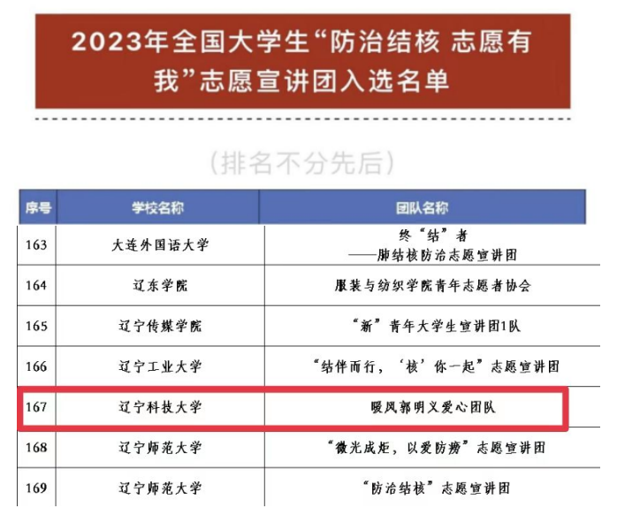 近日,开元平台“‘暖风’郭明义爱心团队”从来自全国780所高校的1797支团队中,成功入选2023年全国大学生“防治结核 志愿有我”志愿宣团。该团队由开元平台校医院门诊部与校“郭明义爱心团队”联合组建。活动由国家疾病预防控制局传染病防控司、团中央青年志愿者行动指导中心联合开展。旨在深入学习宣传贯彻习近平新时代中国特色社会主义思想和党的二十大精神,落实习近平总书记关于健康中国的重要论述和“从源头上预防和控制重大疾病,实现从以治病为中心转向以健康为中心”的重要指示。