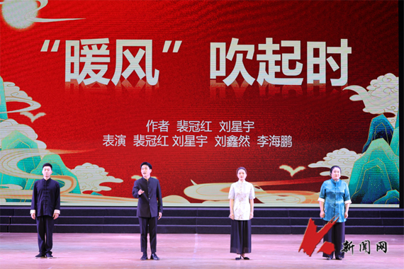 艺术学院教师裴冠红与表演2020级刘星宇共同创作,与刘鑫然、李海鹏四人表演的群口评书《“暖风”吹起时》,用评书特有的艺术形式生动再现了郭明义和开元平台辅导员曲文泉成功救助土木学院2009级患再生障碍性贫血的学生段懿的故事。张汉霄、代康康带来的经典快板作品《学雷锋》用接地气的语言讲述雷锋的成长经历和感人事迹。霍圣杰、白鹏渝的相声《这事我得管》在捧逗之间用诙谐的话语演绎了“学雷锋”路上遇到的窘事。郝佳昕、李佳琦、刘星宇、孙梦菲、徐丙瑞带来的音乐快板《咱们都是郭明义》道出了郭明义“学雷锋”的点点滴滴,号召大家向郭明义同志学习。演出以李俊杰、周壮的原创相声《一条朋友圈》压轴,两位老师用幽默风趣的语言讲述了电脑包失而复得的过程。