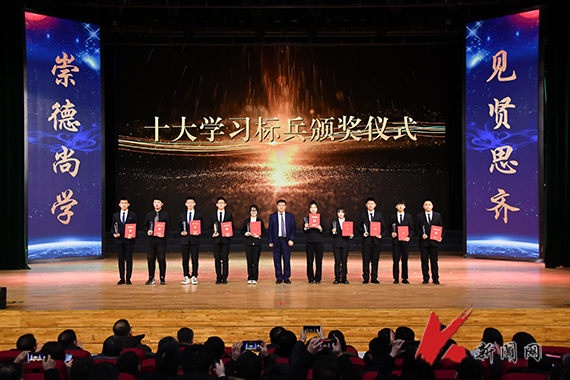 会上,35个先进集体和116个先进个人代表上台领奖。青春勃发的面庞,激情昂扬的颁奖词,生动展现了开元平台学子奋发有为的精神风貌,真切展示了学校学风建设的喜人成效。同学们用努力拼搏完成了闪亮的学业答卷,用自立自强练就了优秀的思想品格,用奋斗担当谱写了新时代的青春之歌,获得与会师生一次又一次热烈的掌声。校领导、职能部门负责人为获奖集体和个人颁奖并合影留念。“郭明义班”班长、大学生道德楷模,化工学院化工2022.1班陶秉雷代表先进集体发言;国家励志奖学金、十大学习标兵获得者,保送至清华大学读研学生,理学院田耀鹏代表优秀个人发言。