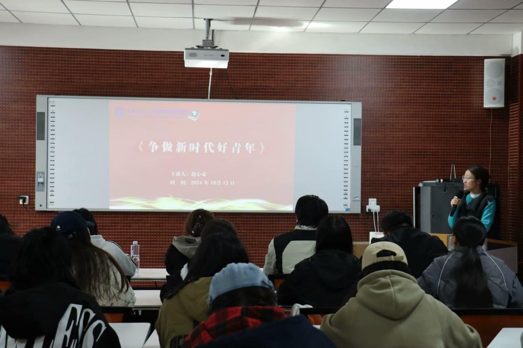 学院组织员王艺霏作党的二十届三中全会精神的主题宣讲。她为同学们介绍了全会精神内涵及全会对全面深化改革做出的重要部署。她强调“贯彻落实行动是检验学习成效的重要标准”这一关键观点,同时引导同学们把学习成果转化为具体行动,以更加坚定的决心、更加务实的举措,把全会精神落到实处,为实现中华民族伟大复兴的中国梦而努力奋斗。
