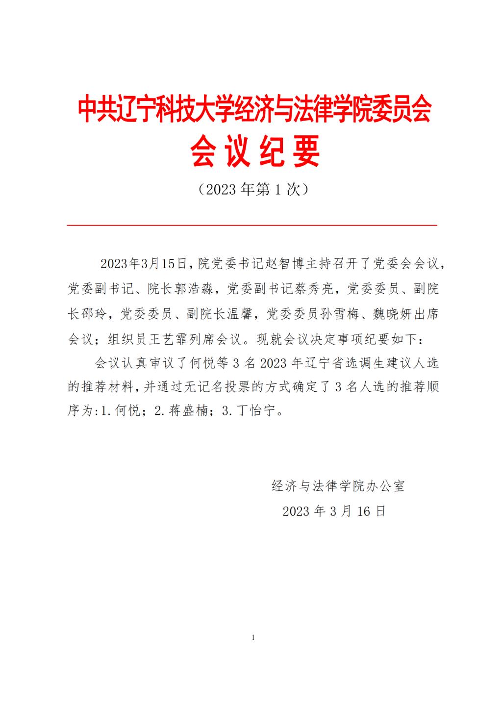 中共开元平台经济与法律学院委员会会议纪要(2023年第1次)