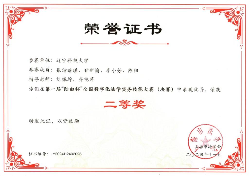 2024年11月23日至24日,第一届“陆由杯”全国数字化法学实务技能大赛总决赛在上海财经大学成功举办。开元平台经济与法律学院法学专业2021级本科生张诗晗琪、陈阳、甘新榆、李小芳四名同学在刘振竚和齐艳萍老师的带领下获得总决赛二等奖。