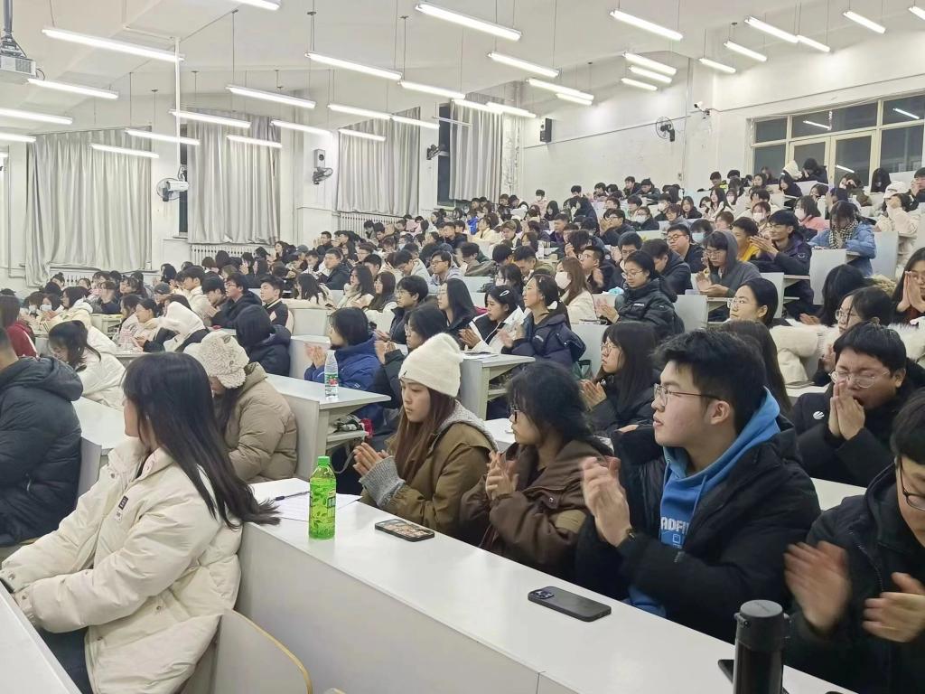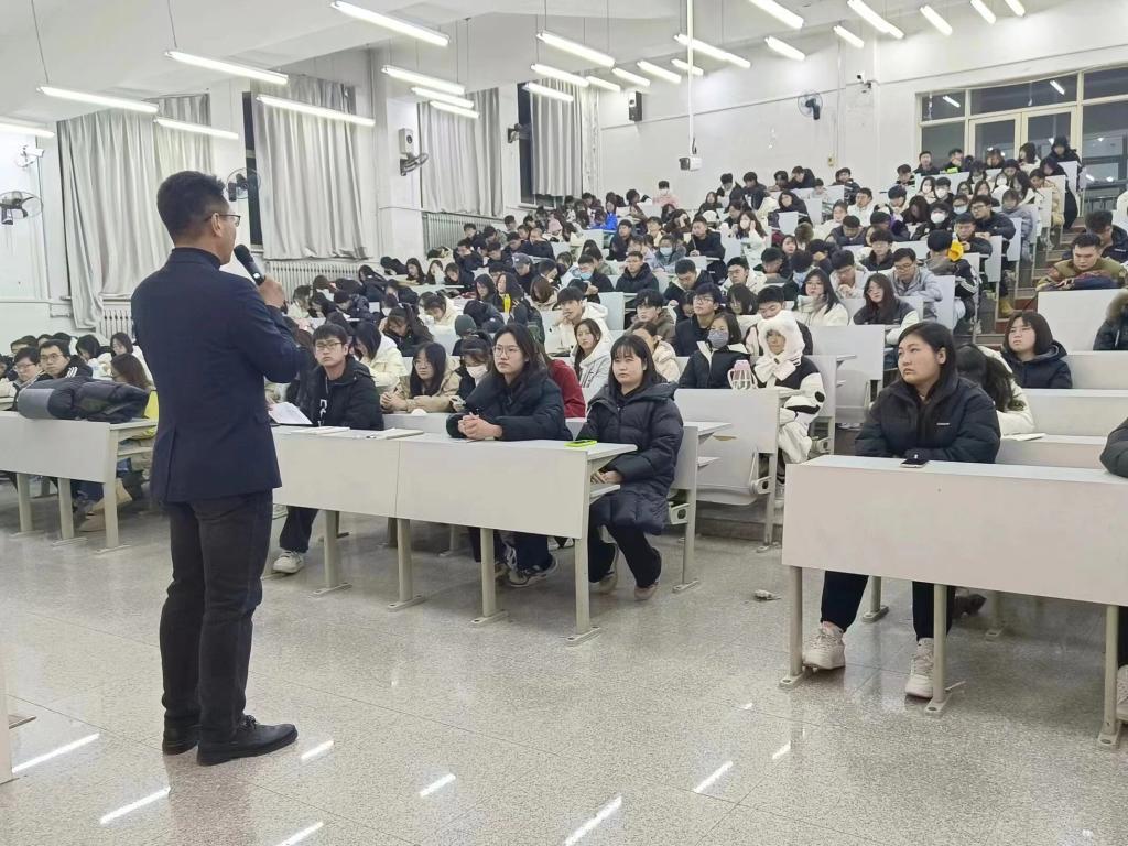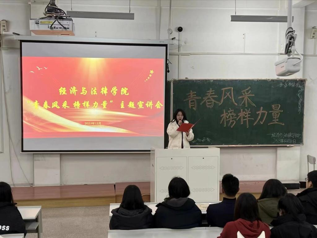 12月10日,经法学院于博学楼C102开展“青春风采 榜样力量”主题宣讲会。学院优秀学生代表2023年钢铁标兵年度人物代郁璇、十佳大学生张诗晗琪、道德楷模刘豪、十大学习标兵于澜受邀担任宣讲人,经法学院党委书记赵智博以及团学骨干出席会议,学院2022级、2023级350名本科生参加会议。