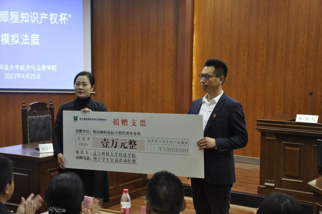 本次活动的开展得到了鞍山顺程商标专利事务所的大力支持,总经理赵琳女士代表顺程公司向经法学院捐赠1万元用于学生开展公益活动。通过开展本次模拟法庭展演活动,不仅为同学们普及了知识产权保护的相关法律知识,让同学们深刻认识到了尊重知识和保护创新的必要性,同时对同学们深入学习贯彻习近平法治思想,提升专业水平和实践能力将起到积极的促进作用。