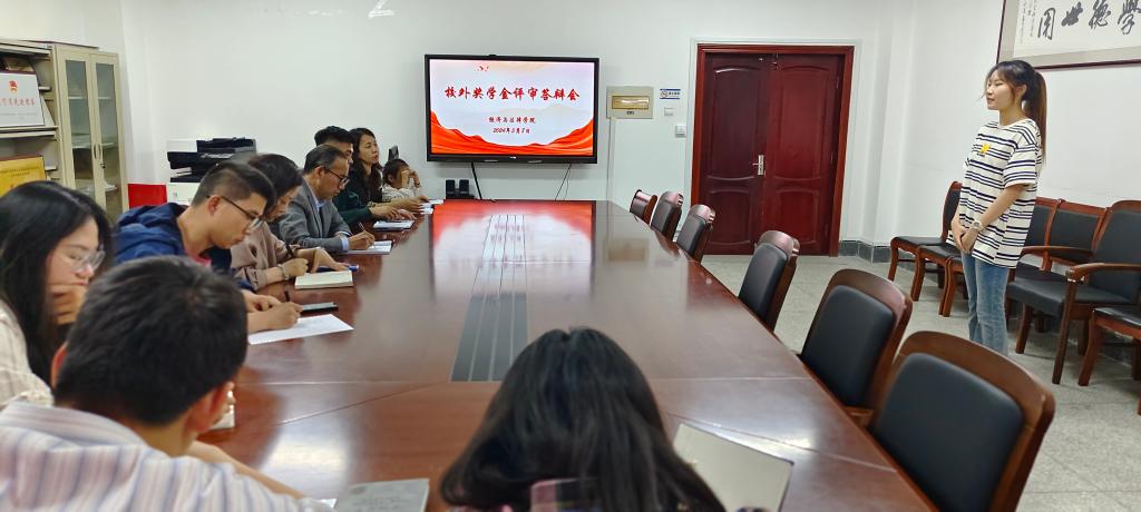 为更好地激励同学们积极进取、奋发向上,树立学生榜样,5月8日下午,经法学院在博识楼A305召开校外奖学金评审答辩会。经法学院党委副书记张国华、学办主任齐艳萍、团委副书记张鹏飞、教师代表魏晓妍、班主任代表李俊及学院学生会主席团成员组成奖学金评审小组,经过层层筛选,共计16名候选人参与答辩。