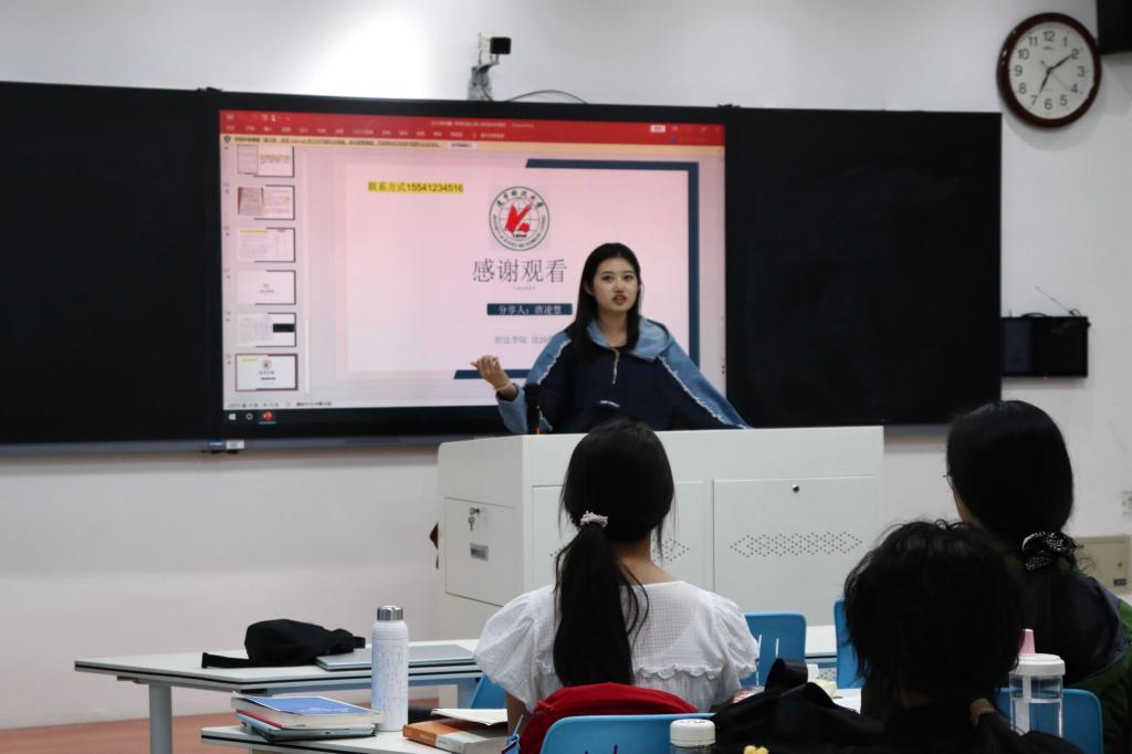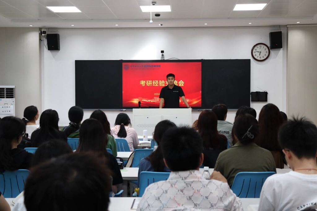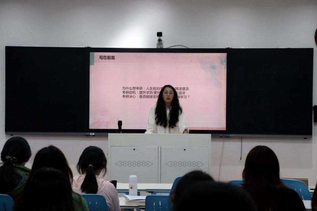 会上,四名2020级的同学分别结合自身经历和所学专业向同学们分享自己考研成功上岸的经验。在院校选择方面,他们凝练出了“定好专业、选择地区、筛选信息、划定范围、利用资源”的“五步定院校”法供大家参考,让同学们对院校选择有了更清晰的认识;在复习备考方面,他们分享了各自在备考过程中对于不同专业和学科的学习方法和备考技巧,同时提醒同学们做好时间管理与分配,规划好相关学科的复习时间与进度,并提醒大家在制定规划时理清思路、灵活应对,为同学们作出了细致而明确的引导;在备考心理上,他们建议备考学生做好打“持久战”的准备,合理分配复习精力,在备考过程中保持良好心态,提升有效学习时间的同时要注意劳逸结合,以自信积极的状态去面对困难。