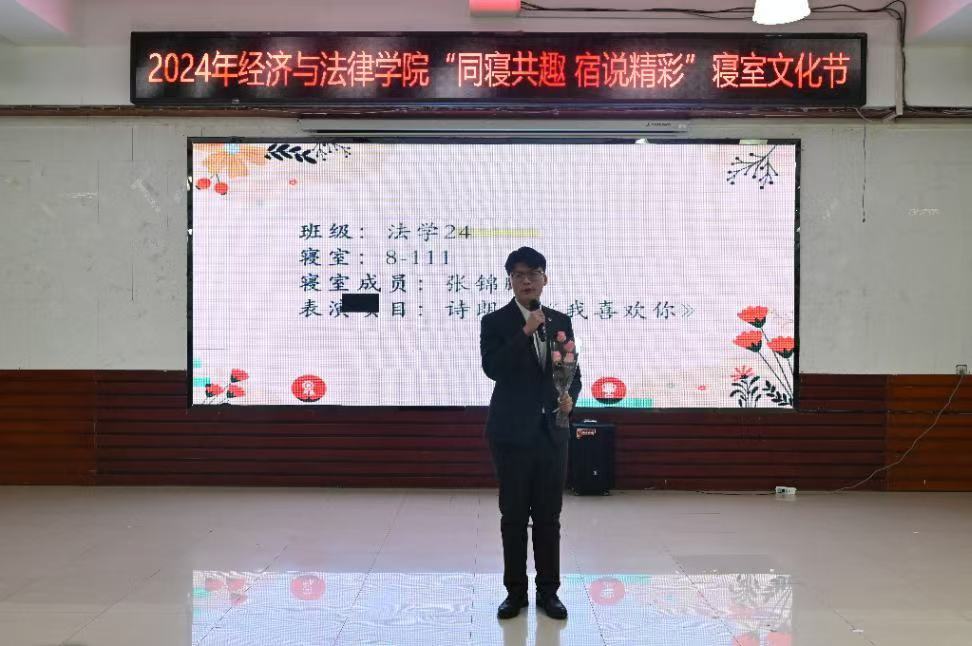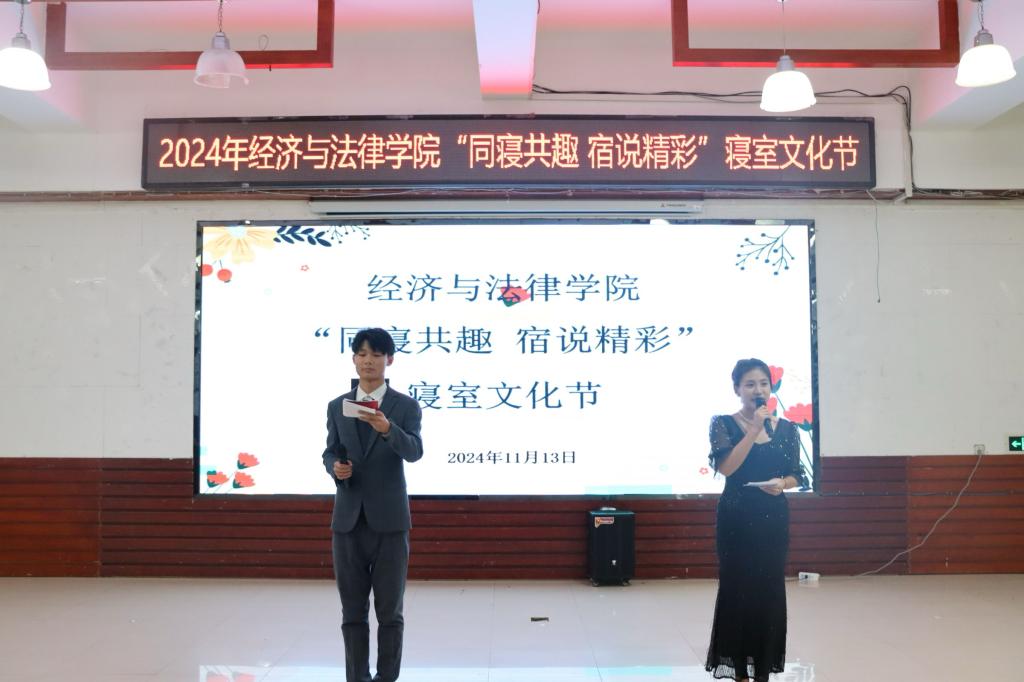 11月13日晚,经法学院于明德楼大学生活动中心举办“同寝共趣 宿说精彩”寝室文化节。经法学院党委副书记张国华、团委副书记张鹏飞、团学骨干以及2024级新生共计300余人参加了本次活动。