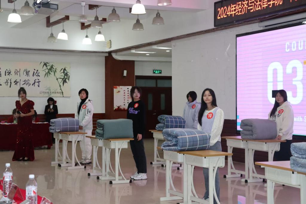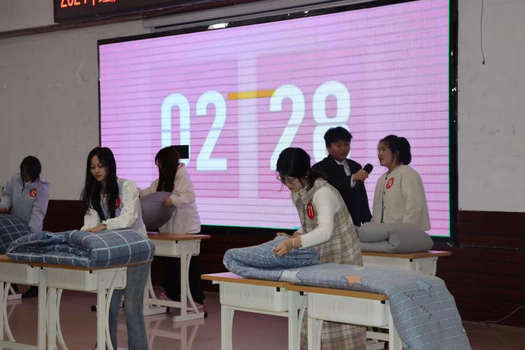 “叠被子大赛”环节同样精彩,随着主持人一声令下,参赛者迅速投入状态。尽管两位主持人轮番提问进行“干扰”,但选手们依旧细致专注地完成被子整理。三分钟后,一床床如艺术品般棱角分明的被子呈现在观众眼前,现场气氛火爆,欢呼声此起彼伏。最后,学院学生会文艺团王美润带来的《这世界那么多人》,以优美的旋律和动人的歌声,引起了观众的情感共鸣。经过激烈的角逐,颁奖嘉宾为获奖学生颁奖,现场爆发出雷鸣般的掌声,这掌声既是对获奖学生的肯定,也是对这场精彩角逐的喝彩。