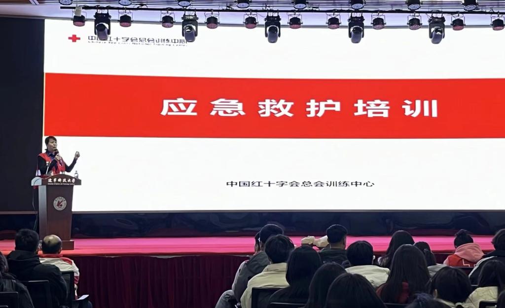 活动中,学院团委副书记张鹏飞对大家的到来表示热烈欢迎,随后,校医院院长程瑶向同学们强调了掌握急救技能的重要性。“当意外发生时,掌握必备的急救技能,关键时刻能救人一命,比如……”鞍山市红十字会应急救护讲师王影以生活中常见的紧急突发情况作为切入点,结合生动的PPT内容为大家深入浅出地讲解了创伤救护、气道异物梗阻、心肺复苏、自动体外除颤器(AED)等专业知识,并利用道具模特展开现场示范教学,向同学们讲解心肺复苏、AED的使用方法、气道梗阻救护等多个实用操作技能。