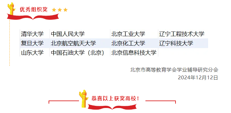 学业辅导研究分会是北京市高等教育学会下属的专业学会,成立于2017年5月,目前是北京以及全国高校进行学业辅导工作沟通、交流、讨论、研究的最高平台。2024年6月12日,北京市高等教育学会学业辅导研究分会面向全国高校启动“新质引领心智,学业促进成才”高校学业辅导优秀案例评选活动,旨在引导高校深入研究“新质生产力对提升学业辅导效能的路径”,从理论创新和实践创新两个方面促进学业辅导工作规范化、精品化、科学化,推动辅导队伍专业化、职业化建设,提升大学生思想政治教育工作质量。此次活动共征集到28所高校51个学业辅导优秀案例。经过专家函评,评选出一等奖12个,二等奖16个,三等奖16个,优秀组织奖11所高校。