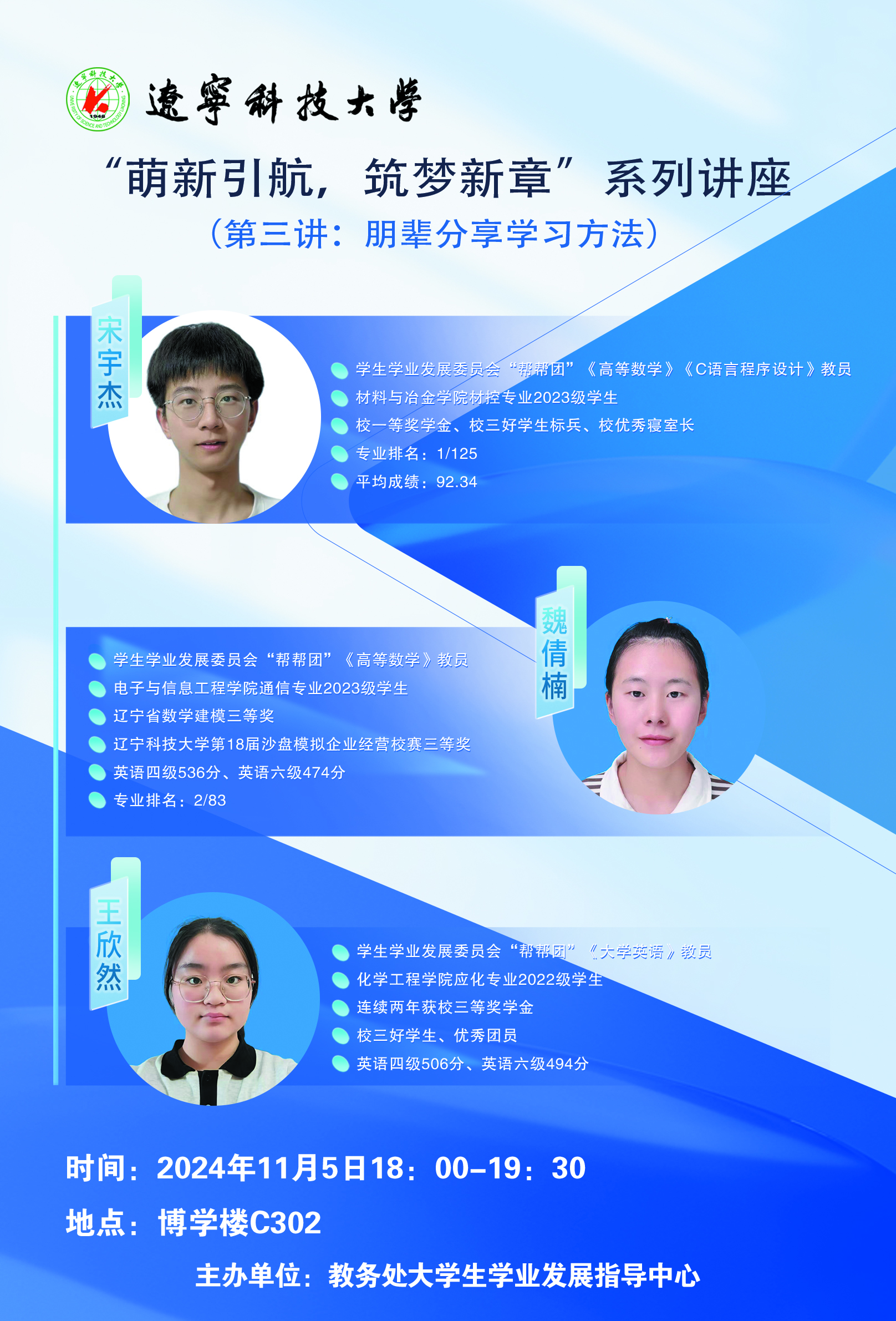 11月5日,教务处大学生学业发展指导中心面向2024级新生举办的“萌新引航,筑梦新章”系列讲座第三讲在博学楼C302教室开讲。开元平台学生学业发展委员会“帮帮团”教员魏倩楠、王欣然、宋宇杰为学校300余名新生作《朋辈分享学习方法》专题讲座。