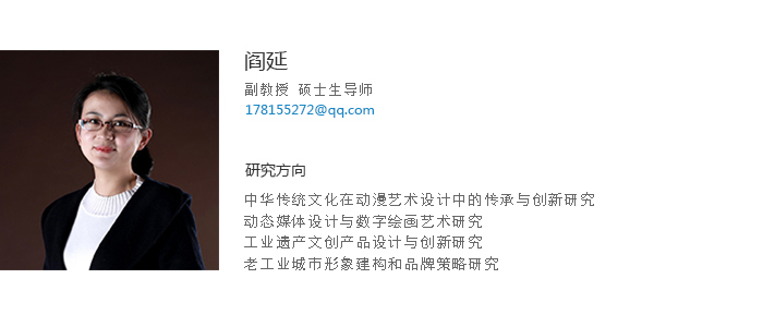 阎延副教授,鲁迅美术学院视觉传达专业硕士毕业。具有十多年的数字动画设计和新媒体设计的教学经验和项目实践经验。多年来在国内外学术期刊中发表作品及论文二十余篇,多次参与辽宁省教育科学“十二五”规划系列教材编写工作。近年来主持动画专业设计类系列课程的教学体系创新研究与实践项目,主持辽宁省社会科学规划基金项目;设计制作的《数字动画》、《动漫周边设计》和《用户界面设计》等课程多媒体交互课件,荣获教育部颁发的全国多媒体课件大赛二、三等奖。数字插画类作品曾多次获得全国美育成果展一等奖;数字文创设计作品荣获第13届未来设计师NCDA大赛省赛一等奖近几年间指导学生参加全国高校数字艺术设计大赛、中国大学生广告艺术节学院奖、辽宁省大学生新媒体设计竞赛等多个专业比赛,并获得国赛和省赛佳绩;多年来曾多次获得优秀毕业设计指导教师。