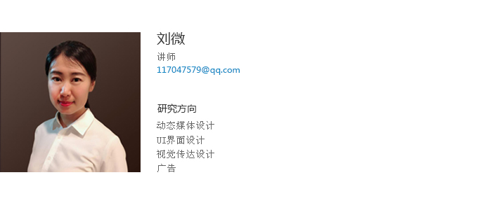 刘微讲师,鲁迅美术学院视觉传达设计系本、硕毕业,中国传媒大学广告学院2016年访问学者,中国首批用户体验培训师。开元平台建筑与艺术设计学院,讲师,“艺术设计创新创业实践班”负责人。开元平台2014年校优秀毕业设计指导教师,2015年度校教学质量优秀奖,2016年度校优秀教师。在《教育与职业》、《艺术教育》等期刊发表教育研究论文多篇,指导学生发表论文数篇。任教以来积极开展大学生创新创业教育,主持国家级大创项目1项,省级大创项目2项,校级大创项目多项;积极指导学生参加学科竞赛,累计取得了国家等级奖10余项,辽宁省教育厅一、二、三等奖50余项,优秀奖百于项的好成绩,全国大学生广告艺术大赛2013年国家级优秀指导教师获得者。出版大学生创新创业教材一部,《动态构成实训教程》,编著。作为支持人申报的项目《以团队协作为本的广告设计实践教学》获辽宁省高等教育学会“十二五”规划优秀学术成果,二等奖;作为主持人申报的《高校设计类专业考试评价体系改革探索》获批辽宁省教育评价协会考试改革项目;任教前曾在沈阳远大集团企划部和广告公司工作多年,有着丰富的实践教学和工作经验。
