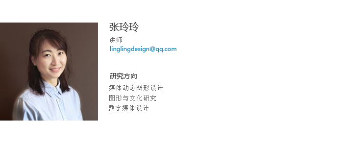 张玲玲讲师,硕士,鲁迅美术学院视觉传达专业毕业。于北京五谛数字艺术教育基地取得数字艺术从业资格。具有多年图形设计及数字媒体制作及教学经验。在《电影文学》、《艺术教育》、《美术大观》等专业刊物发表专业研究及教学研究论文多篇。指导学生发表论文数篇。参与出版教材一部,主持、参与开元平台青年基金项目多项。主持省级大学生创新创业训练1项,校级多项。获开元平台教学大赛三等奖,优秀毕业设计指导教师,指导学生获得全国大学生广告艺术大赛全国三等奖、辽宁赛区一等奖、二等奖、三等奖。获优秀指导教师称号。
