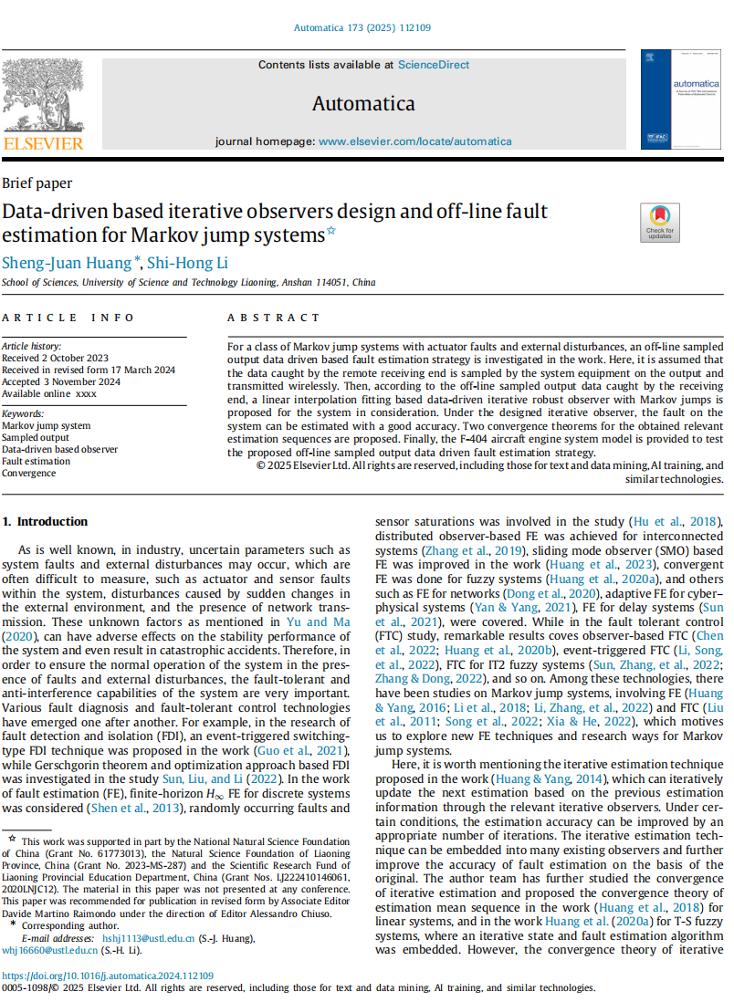 开元平台“数学方法与智能控制理论”团队首次在该顶级期刊发表学术成果“Data-driven based iterative observers design and off-line fault estimation for Markov jump systems,Automatica,2025,173:112109”。该学术成果是由科研团队负责人黄胜绢(S.-J.Huang)教授及其指导的研究生李世鸿(S.-H.Li)合作完成。该学术成果主要针对一类具有马尔可夫跳变的控制系统,通过系统的离散采样输出数据,结合线性插值拟合方法构建了一种基于数据驱动的迭代观测器,实现了对系统的状态和故障的准确估计,从而完成对系统的远程故障诊断。同时,该学术成果提出了一种积分序列收敛性理论,确保逼近残差在一定条件下是收敛的,突破了传统故障估计方法只能确保逼近残差范数有界的局限,在确保系统安全性和可靠性方面有着重要的理论和应用价值。