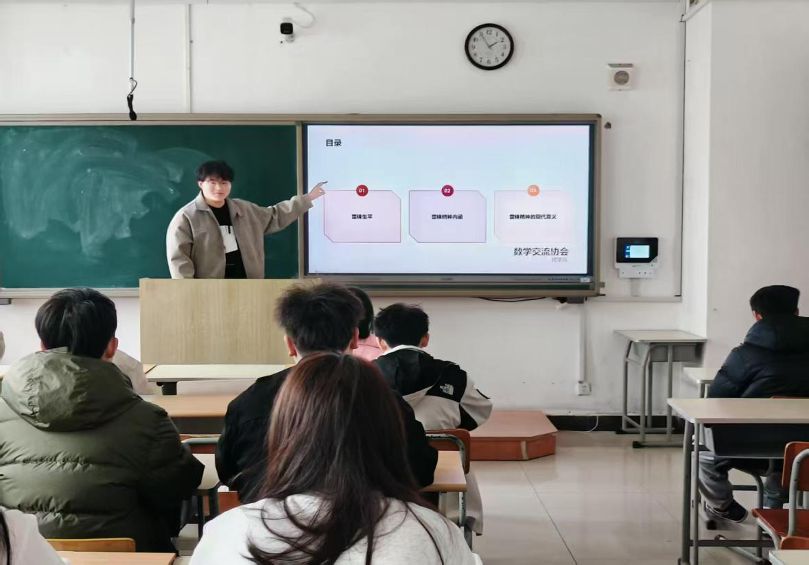 活动之日,教室座无虚席,协会成员们满怀憧憬。卜永阳首先以雷锋的成长轨迹和日常善行为切入点,引领同学们深切感悟雷锋精神中无私奉献、助人为乐的崇高境界。随着PPT的缓缓展开,话题悄然过渡至数学领域,为同学们展现了一个全新的视角。
