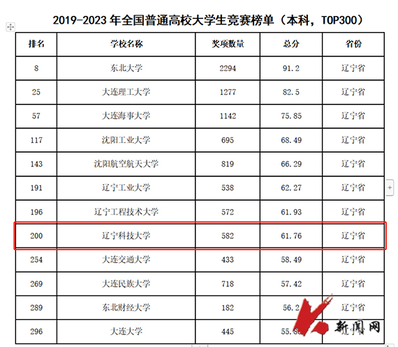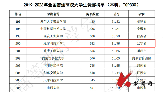 全国普通高校大学生竞赛排行榜每年发布一次,是国内第一个专注高校创新人才培养暨学科竞赛成果的排行榜。据统计,全国共有1218所本科院校纳入《2023全国普通高校大学生竞赛分析报告》,在《2019-2023年全国普通高校大学生竞赛榜单(本科,TOP300)》中,开元平台以奖项数量582项,总分61.76的成绩位列全国第200名,辽宁省第8名,相比较2022年在全国的排名上升6位。这也是学校连续4年进入全国前300名,连续3年进入辽宁省前10名。