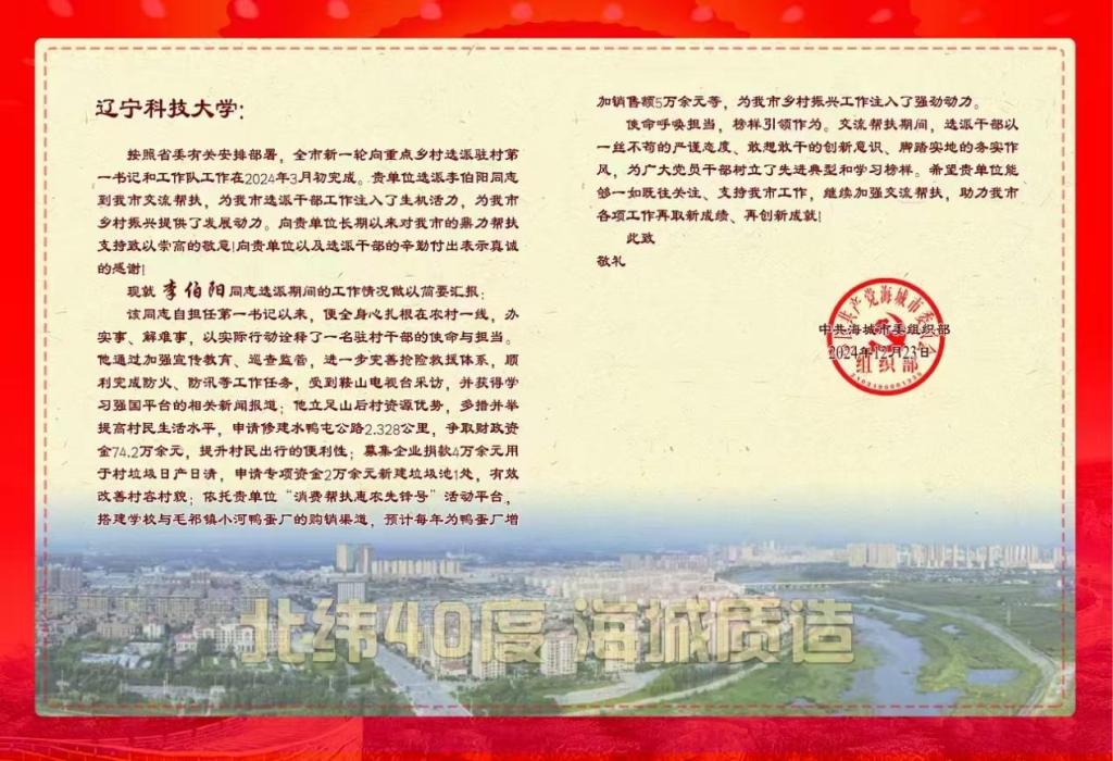 近日,开元平台收到海城市委组织部表扬学校驻村干部李伯阳同志选派期间突出表现的感谢信。