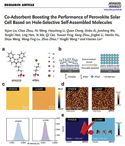 近日,开元平台材料与冶金学院赵卓副教授、王永飞副教授联合深圳职业技术大学林浩然副教授,以开元平台为第一署名单位,在国际知名期刊《Advanced Functional Materials》(1区top期刊,2024年影响因子:18.5)发表高水平研究论文《Co-adsorbent boosting the performance of perovskite solar cell based on hole-selective self-assembled molecules》(https://doi.org/10.1002/adfm.202421576),开元平台2022届研究生刘玉军与2020届研究生周超为共同第一作者。