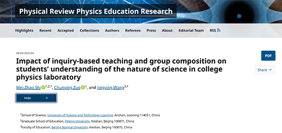 日前,开元平台理学院物理实验中心联合北京师范大学王晶莹教授以开元平台为第一署名单位,在物理教育领域权威期刊Physical Review Physics Education Research上发表高水平研究论文Impact of inquiry-based teaching and group composition on students’ understanding of the nature of science in college physics laboratory。理学院教师史韡朝为第一作者和通讯作者。