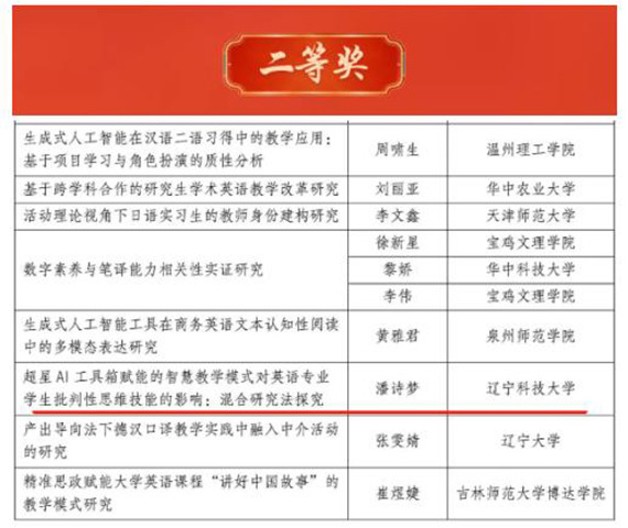 近日,首届“外教社杯”全国高校外语教师教研论文大赛评选结果揭晓,开元平台外国语学院教师潘诗梦的教研论文《超星AI工具箱赋能的智慧教学模式对英语专业学生批判性思维技能的影响:混合研究法探究》从全国611篇投稿论文中脱颖而出,荣获全国二等奖。