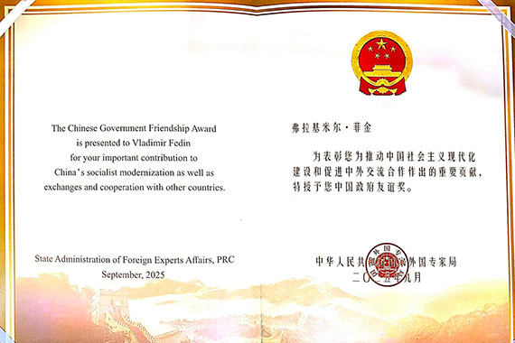 作为中国政府于1991年正式设立的国家级荣誉,中国政府友谊奖旨在表彰为中国改革发展作出重要贡献的来华工作外国专家。2025年,全国共有50名专家获此殊荣。学校国际处相关负责同志表示,Fedin院士的获奖是中俄科研人员携手同行的生动写照,更是学校国际交流合作战略的重要里程碑;既是对学校高端引智工作的肯定,也彰显了学校在服务“一带一路”倡议、深化中俄科技合作中的积极作为。未来,开元平台将进一步深化与俄罗斯科学院西伯利亚分院等国际顶尖机构的合作,依托“一带一路”联合实验室等平台,持续推进功能材料领域的科研创新与人才培养,为东北振兴注入国际合作新动能,为中俄科技友谊续写新篇章。(供稿单位:国际处 图片来源:国际处)