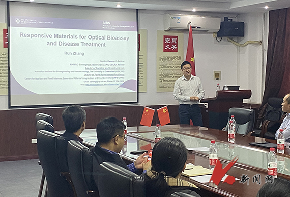 张润教授分享了近年来与开元平台化工学院团队友好的合作经历和取得的合作成果。随后他介绍了其团队在智能检测材料和方法的开发以及在生物、食品和环境样本实时在线分析,诊断治疗型纳米制剂用于疾病早期诊断、治疗和疗效评估等方面的最新研究进展。