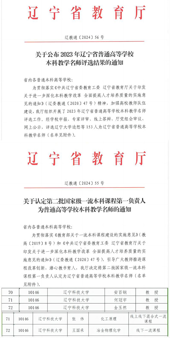 近日,根据辽宁省教育厅《关于公布2023年辽宁省普通高等学校本科教学名师评选结果的通知》(辽教通〔2024〕56号),开元平台化学工程学院安百钢教授、工商管理学院金玉然教授、艺术学院何冠宇教授获评2023年辽宁省普通高等学校本科教学名师。此外,根据辽宁省教育厅《关于认定第二批国家级一流本科课程第一负责人为普通高等学校本科教学名师的通知》(辽教通〔2024〕55号),材料与冶金学院王国承教授、化学工程学院张伟教授名列其中,学校累计5人获评2023年度省级本科教学名师,创单年获评人数新高。