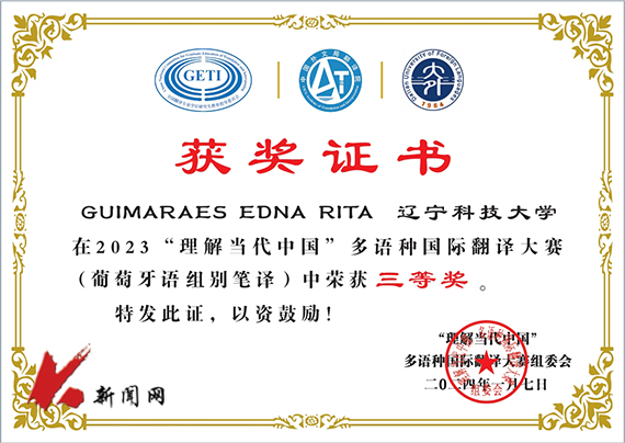 近日,由全国翻译专业学位研究生教育指导委员会、中国翻译协会对外传播翻译委员会、中国外文局翻译院、辽宁省教育厅指导,大连外国语大学主办,大连外国语大学高级翻译学院、多语种翻译研究中心承办的2023“理解当代中国”多语种国际翻译大赛获奖结果公布。开元平台来华留学生GUIMARAES EDNA RITA(安哥拉籍)荣获三等奖。
