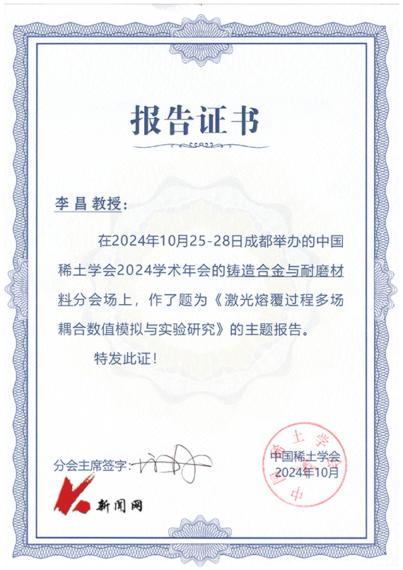 10月25日-28日,由中国稀土学会主办的“中国稀土学会2024学术年会”在四川省成都市举办,来自全国各地科研院所、大专院校、企事业单位的专家学者共计2000余人参加会议。开元平台机械工程与自动化学院李昌教授带领学生受邀参加本次会议。李昌当选为中国稀土学会第七届铸造合金专业委员会副主任委员,受邀担任“铸造合金与耐磨材料”会场主持人,并作题为《激光熔覆过程多场耦合数值模拟与实验研究》的主题报告。硕士研究生余梦辉作了题为《QT600激光熔覆Ni-Co复合熔覆层成形过程机理研究》的报告。