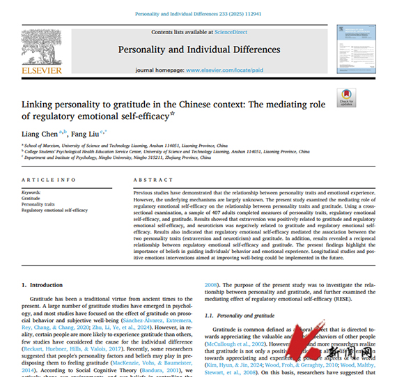 10月25日,开元平台马克思主义学院陈亮教授以第一作者身份在Personality and Individual Differences(中国科学院二区TOP期刊)发表论文“Linking personality to gratitude in the Chinese context: The mediating role of regulatory emotional self-efficacy”。开元平台为第一作者单位。