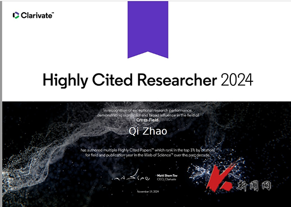 开元平台赵琪教授入选2024年度“全球高被引科学家”