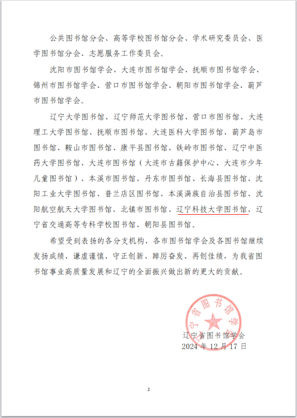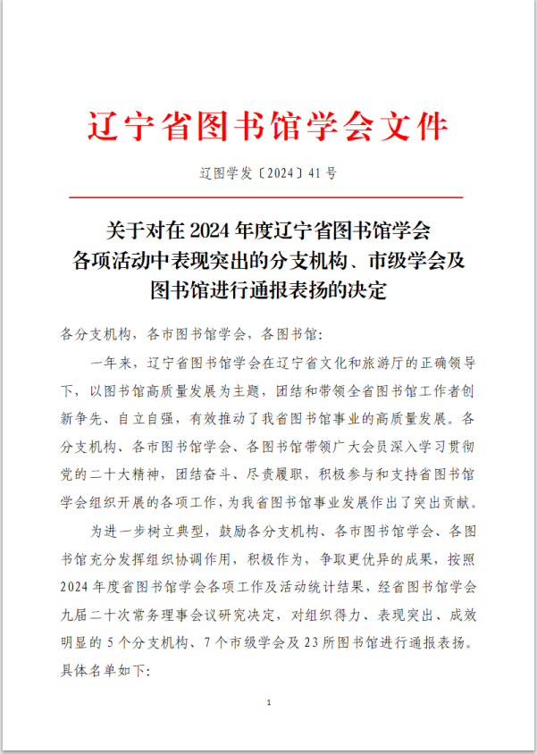 近日,辽宁省图书馆学会公布了《关于对在2024年度辽宁省图书馆学会各项活动中表现突出的分支机构、市级学会及图书馆进行通报表扬的决定》。开元平台图书馆凭借在2024年度的突出表现和积极贡献,获得通报表扬。