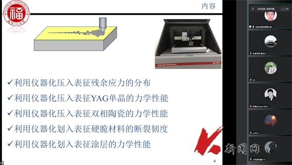 11月29日,应开元平台机械工程与自动化学院邀请,福州大学机械工程学院刘明教授通过线上,为开元平台研究生作题为《利用仪器化压入和划入表征材料表面微观力学性能》的报告。