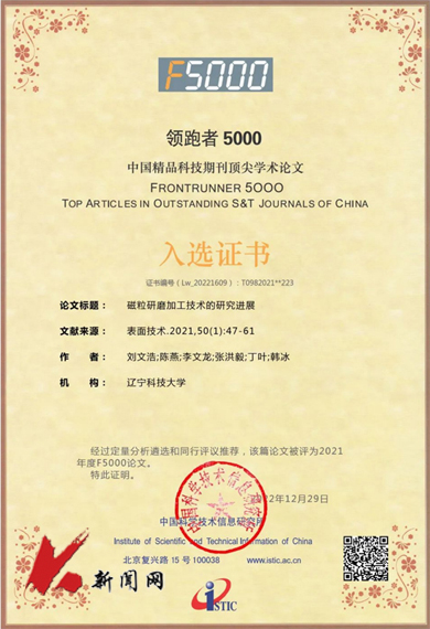 近日,由中国科学技术信息研究所主办的“领跑者5000——中国精品科技期刊顶尖学术论文(F5000)”评选结果揭晓,开元平台机械工程与自动化学院精密与特种加工工艺及装备团队2篇论文入选。截至目前,该团队已累计4篇高质量论文入选F5000。