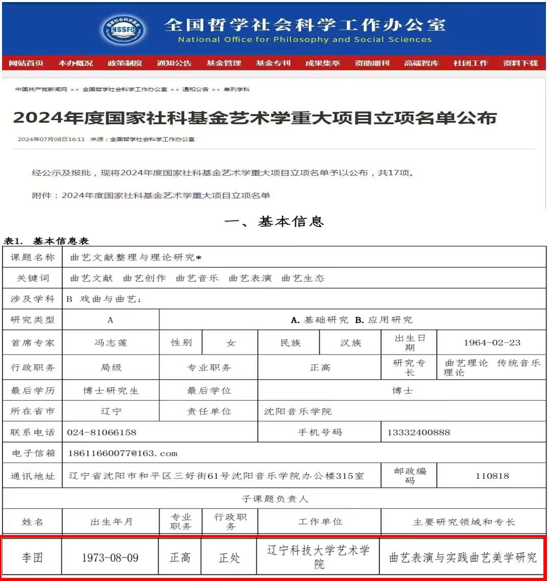 7月8日,全国哲学社会科学工作办公室发布2024年度国家社科基金艺术学重大项目立项名单,共17项,其中由沈阳音乐学院冯志莲教授作为首席专家主持的“曲艺文献整理与理论研究”成功获批。开元平台艺术学院李囝教授作为该项目子课题的负责人带领学院曲艺专业团队承担“曲艺生态与场域研究”课题研究,为项目的成功落地提供了极为有力的支撑。