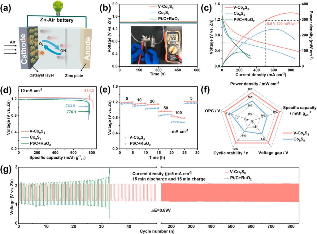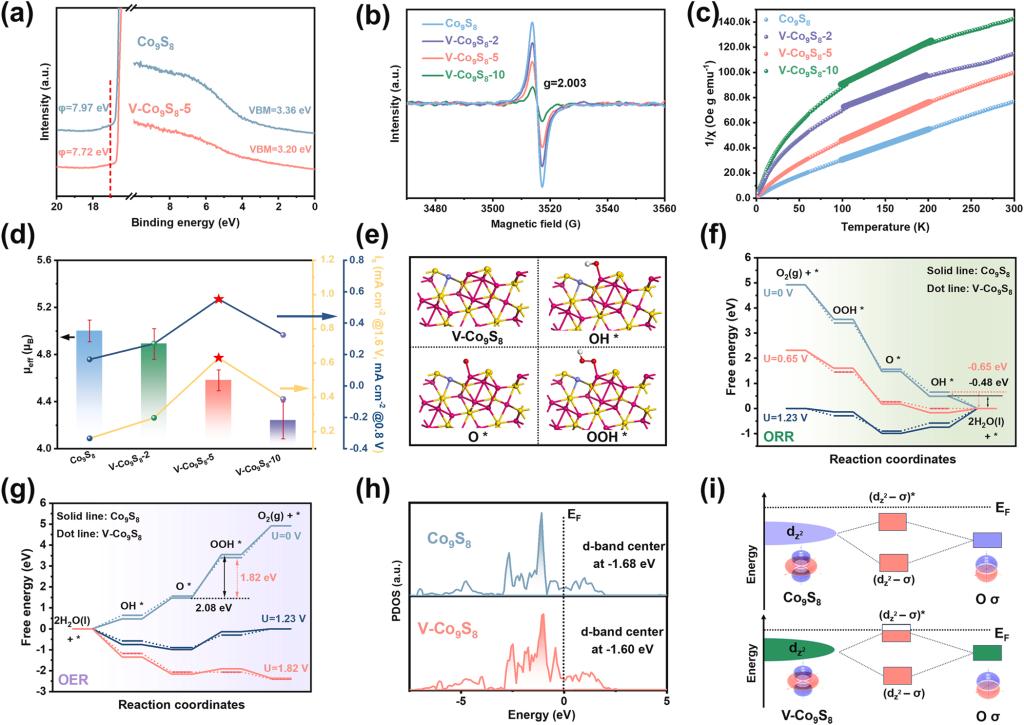 8纳米粒子晶格中原子水平的钒掺杂,从而调控催化剂电子构型(图1)。研究发现,适量的钒掺杂水平,即对催化剂电子结构的温和调控能够优化Co的自旋态,平衡反应过程中氧中间体的吸附/解吸,从而加速氧反应动力学(图2)。实验研究证实,使用V-Co9S8作为空气阴极催化剂组装的锌-空气电池可提供超高功率密度(345 mW cm